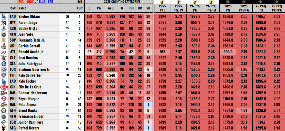 Similar to Underdog, I converted last year’s DK scoring by total and per plate appearance, plus the same for 2026 projections. Found something really interesting in the inter-site scoring — they call that a tease…