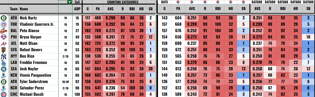 ⚾🏆MLBMA Fantasy Baseball: First Base Preview🏆⚾ Two-time FSWA Winner & Best-selling Substack Author -- "When you work this hard, winning feels a lot less like luck"Jan 31, 2026∙ Paid4ShareFirst Base Projections📝 Articles So far…▪ New Hitters In The 2026 Pool ▪ Best A.L. 6th Starting Pitchers ▪ Best N.L. 6th Starting Pitchers ▪ Bargain Bin First Basemen +250 ADP▪ Bargain Bin Second Basemen +250 ADP▪ Bargain Bin Shortstop Basemen +250 ADP▪ Bargain Bin Third Basemen +250 ADP▪ Bargain Bin Outfielders +250 ADP▪ Bargain Bin Starting Pitchers +250 ADP▪ Catcher Plan🖥 Instructions To Use Top-525 Features Contact me on X anytime @JohnLaghezza with comments or questions🎙 Corked Stats Podcast Link (Paid Subs Get Exclusive Content)CHECK OUT MY PINNED POST FOR SAMPLES OF DATA PROVIDED w/SUBSCRIPTIONTop-525 rankings update constantly right up to Opening Day as news and trades developMLBMA / NFLMA Substack Today:⚾Top-525 Fantasy Baseball Rankings are LIVE!⚾ 2026 Hitter Sheet — YTD with L/R, 2H Splits⚾ 2026 Starting Pitcher Sheet — YTD with L/R Splits⚾ Lineup Tracker + ADP Tool⚾ 2026 MLB Best Ball Projections + Uploadable Ranks⚾🆕 Adjusted BAT X 600 Projections🎙 CHECK OUT THE EXCLUSIVE CORKED STATS PODCAST🏈 NFL Advanced Team + Player Data / Differentials🏈 Playoff Projections + Optimal150💾 MLBMA In-Season Daily Schedule 💾 ▫️FG/F5 Algorithm Results + Advanced Stats▫️MLB Implied Team Totals▫️Cooked Bullpen Report▫️SP Prop Cheat Sheet▫️Daily SP Ranks▫️Hitter Base Props On ALGO Tab (💣= HR +4 BASES / 💥 = +2 BASES / ⚾️ = +1 BASE HIT)▫️Strikeout Projections▫️Fantasy Baseball Waivers▫️🎙️🤬Corked Stats Podcast (Daily Mon-Sat)APPRECIATE EVERY ONE OF YOU, THANKS FOR THE SUPPORT - I WILL NEVER STOP WORKING FOR YOU!HOW MUCH OF YOUR TIME IS WORTH TWO BUCKS A WEEK? SubscribeContinue reading this post for free, courtesy of John Laghezza.Claim my free postOr purchase a paid subscription.