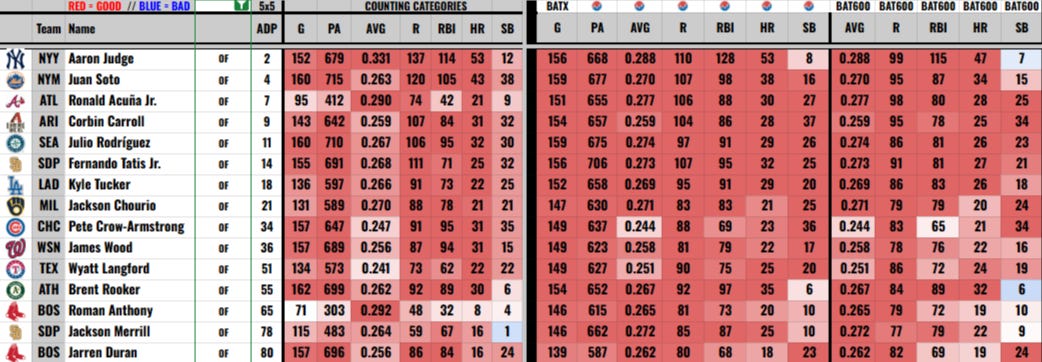 ⚾🏆MLBMA Fantasy Baseball: Outfield Draft Plan🏆⚾ Two-time FSWA Winner & Best-selling Substack Author -- "When you work this hard, winning feels a lot less like luck"Feb 09, 2026∙ PaidShareOF-1 ProjectionsLove using these projection-based snapshots for the most concise look at positional depth. Enjoy another set of write-ups and all the new podcasts. Rankings updating non-stop…📝 Articles So far… (Going To Condense All These To A Single Link Later Today)▪ New Hitters In The 2026 Pool ▪ Best A.L. 6th Starting Pitchers ▪ Best N.L. 6th Starting Pitchers ▪ Bargain Bin First Basemen +250 ADP▪ Bargain Bin Second Basemen +250 ADP▪ Bargain Bin Shortstop Basemen +250 ADP▪ Bargain Bin Third Basemen +250 ADP▪ Bargain Bin Outfielders +250 ADP▪ Bargain Bin Starting Pitchers +250 ADP▪ Catcher Plan▪ First Base Preview▪ Second Base Preview▪ Shortstop Preview▪ Third Base Preview🎙 Corked Stats Podcast Link (Paid Subs Get Exclusive Content)CHECK OUT MY PINNED POST FOR SAMPLES OF DATA PROVIDED w/SUBSCRIPTIONTop-525 rankings update constantly right up to Opening Day as news and trades developMLBMA / NFLMA Substack Today:⚾Top-525 Fantasy Baseball Rankings are LIVE!⚾ 2026 Hitter Sheet — YTD with L/R, 2H Splits⚾ 2026 Starting Pitcher Sheet — YTD with L/R Splits⚾ Lineup Tracker + ADP Tool⚾ 2026 MLB Best Ball Projections + Uploadable Ranks⚾🆕 Adjusted BAT X 600 Projections🎙 CHECK OUT THE EXCLUSIVE CORKED STATS PODCAST🏈 NFL Advanced Team + Player Data / Differentials🏈 Playoff Projections + Optimal150💾 MLBMA In-Season Daily Schedule 💾 ▫️FG/F5 Algorithm Results + Advanced Stats▫️MLB Implied Team Totals▫️Cooked Bullpen Report▫️SP Prop Cheat Sheet▫️Daily SP Ranks▫️Hitter Base Props On ALGO Tab (💣= HR +4 BASES / 💥 = +2 BASES / ⚾️ = +1 BASE HIT)▫️Strikeout Projections▫️Fantasy Baseball Waivers▫️🎙️🤬Corked Stats Podcast (Daily Mon-Sat)APPRECIATE EVERY ONE OF YOU, THANKS FOR THE SUPPORT - I WILL NEVER STOP WORKING FOR YOU!HOW MUCH OF YOUR TIME IS WORTH TWO BUCKS A WEEK? SubscribeContinue reading this post for free, courtesy of John Laghezza.Claim my free postOr purchase a paid subscription.
